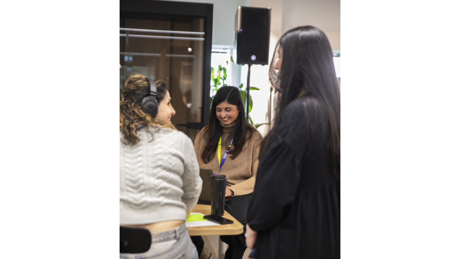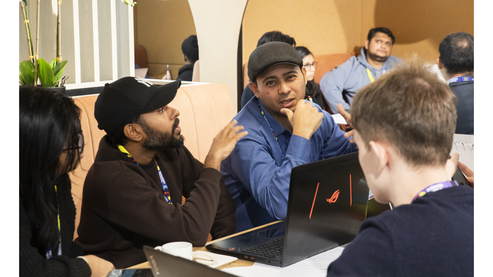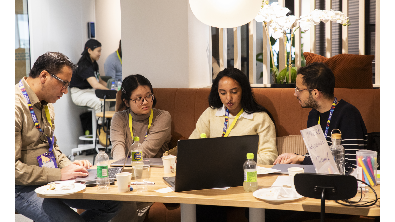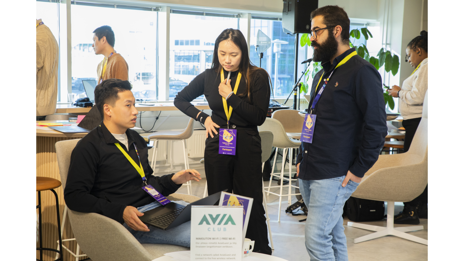 Three people are engaged in a discussion in a bright, modern workspace. One person sits with a laptop while the other two stand nearby, all wearing event badges and lanyards. A table with signage and materials is in the foreground, and other people work in the background.