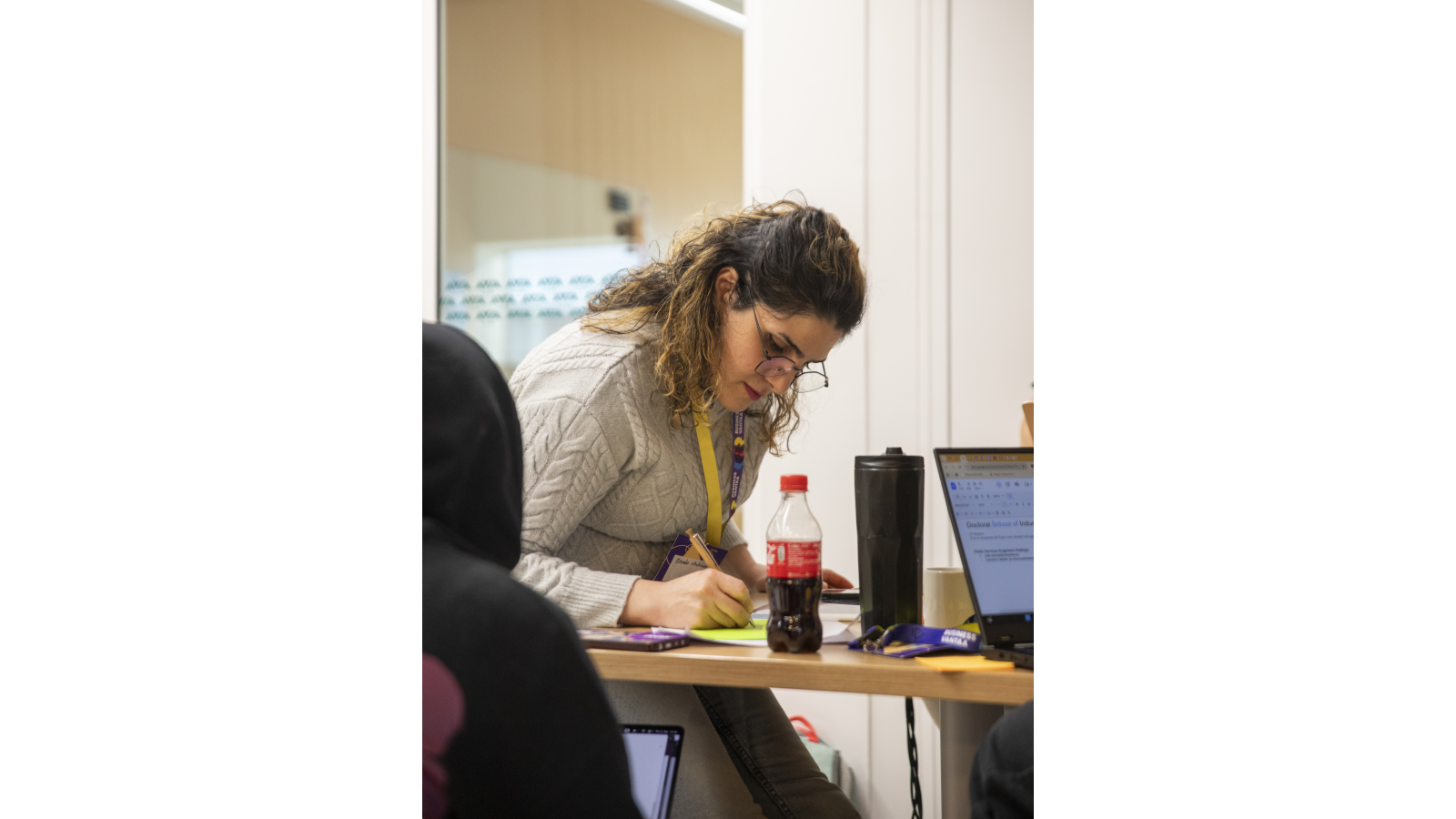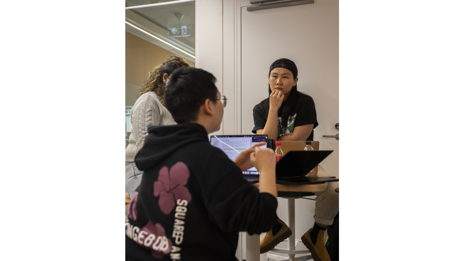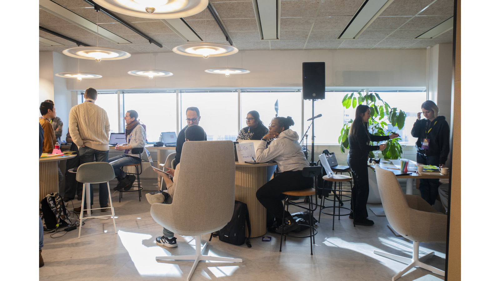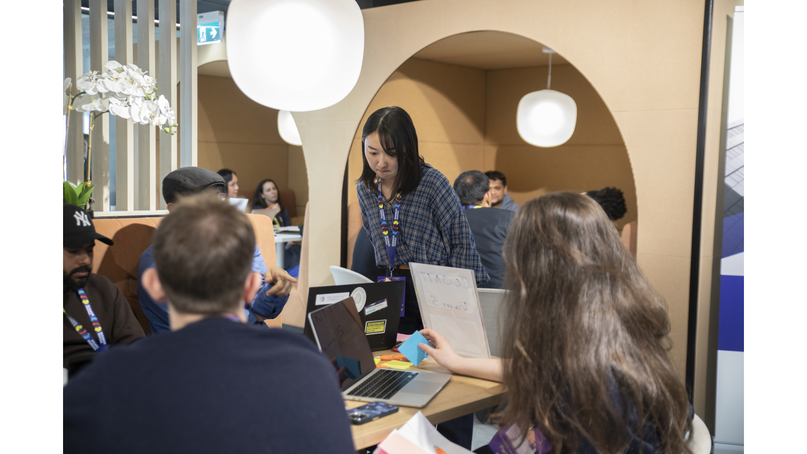 Three people are engaged in a discussion in a bright, modern workspace. One person sits with a laptop while the other two stand nearby, all wearing event badges and lanyards. A table with signage and materials is in the foreground, and other people work in the background.