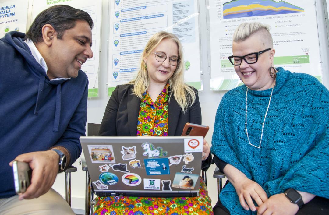 Codemendersin Aseem Shakuntal ja Aava Ruokolainen sekä Vantaan kuntalaispalvelujen palveluesihenkilö Anu Parvela-Säde ovat innoissaan pian alkavasta kokeilusta. Pian jonotus onnistuu Vantaa-infon Tikkurilan ja Myyrmäen pisteissä puhelimen avulla.