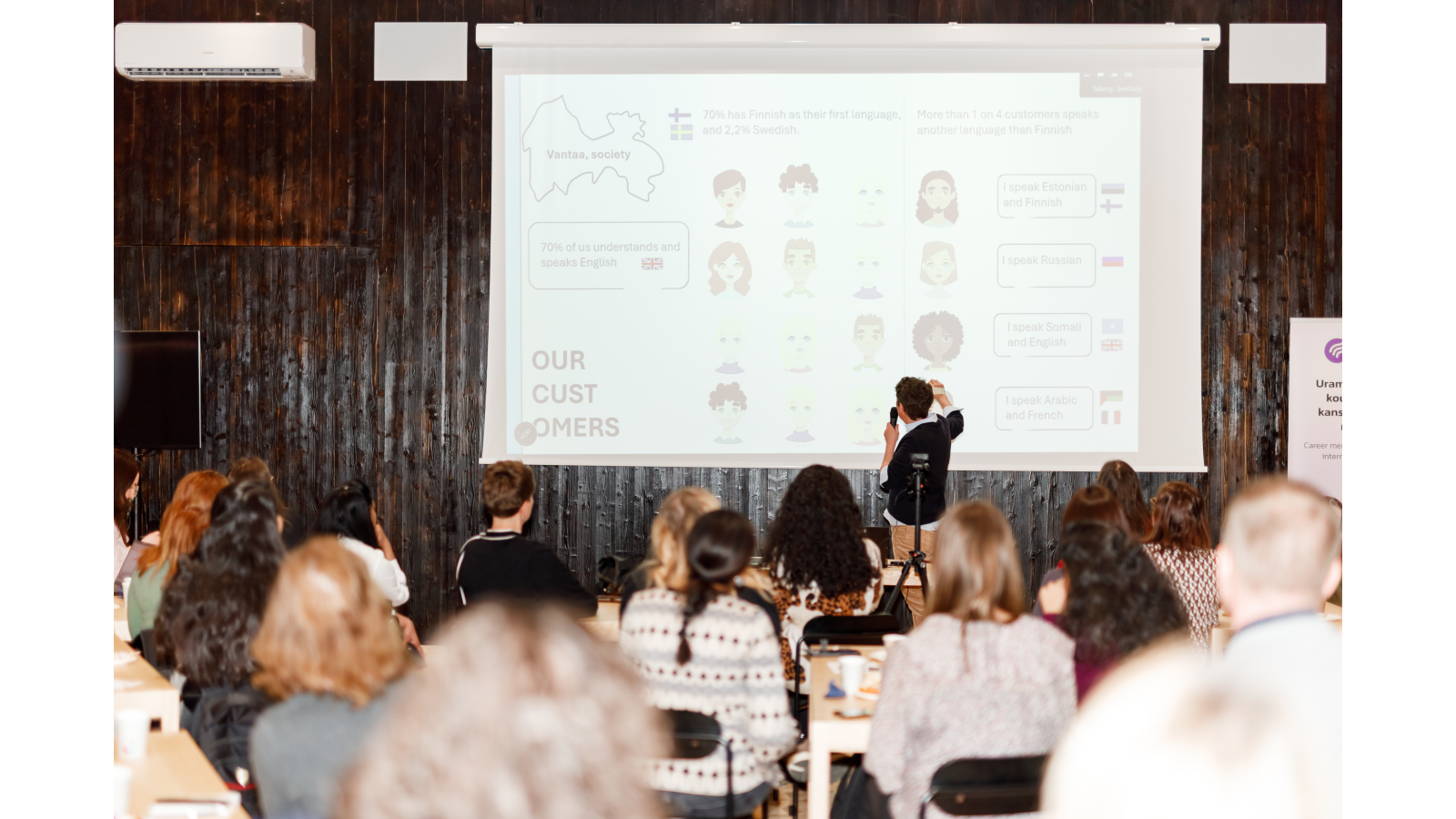 Puhuja esittelee aihettaan mikrofonin kanssa seminaaritilassa. Taustalla näkyy projektorikuva ja tapahtuman esittelyjuliste.