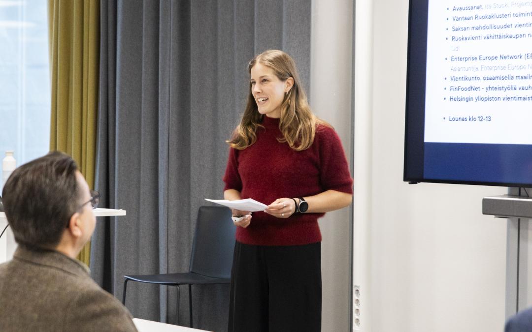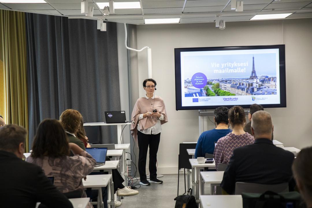 Ennen kuin vienti alkaa, yritysten on pohdittava, mitä ja minne viedään. Apua tarjoaa esimerkiksi Uudenmaan ELY-keskuksen Vientikunto-ohjelma, josta kertoi Maarit Haavisto-Koskinen. Ohjelma tukee yrityksiä, jotka jo tietävät potentiaaliset kohdemarkkinansa.