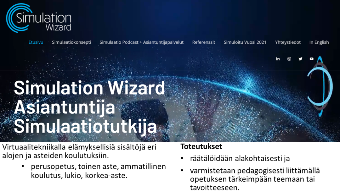 Virtuaalikokemus avaimet käteen periaatteella, se on Simulation Wizardin tarjous. Palvelun toteuttaa kasvatusalan ja koulutuksen asiantuntija Anssi Salmi, joka tietää miten simulaatioita voi ja kannattaa käyttää. Lue lisää blogista ja tartu tilaisuuteen.