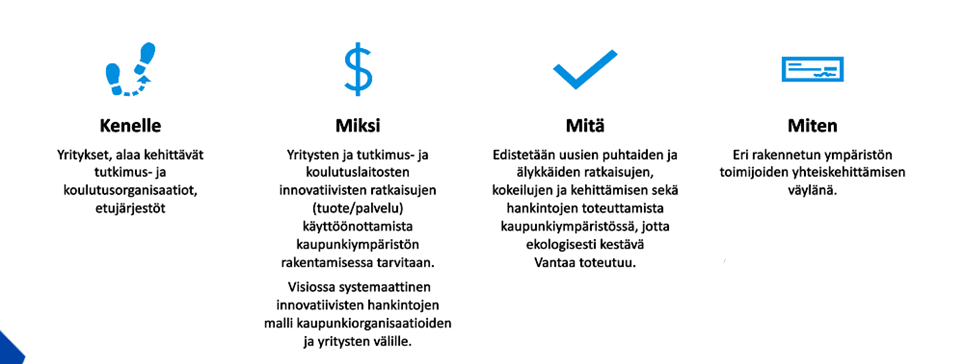 Vantaan kaupunki on tunnistanut innovaatiotoiminnan skaalautumisessa merkittäviä haasteita, jotka eivät kosketa ainoastaan Vantaan kaupunkia. Yksityisen- ja julkisen sektorin yhteiskehittämisellä sekä eri hankkeiden välisessä yhteistyössä keskitytään kaupunkikohtaiseen kokeilujen mahdollistamiseen rakennetun ympäristön kiertotaloudessa, vähähiilisessä rakentamisessa ja luonnon monimuotoisuudessa.